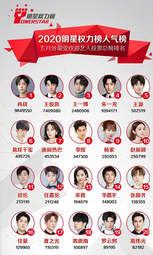 五月明星權力榜出爐 肖戰第一王俊凱第二